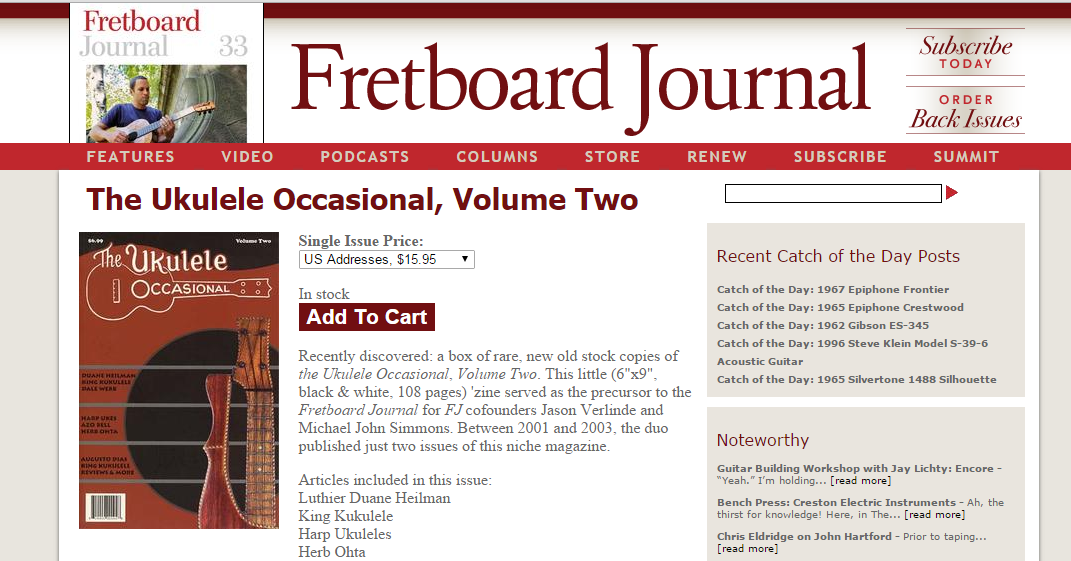 Fretboard JournalThe “Fretboard Journal” is interesting. They have the occasional article on Ukulele but it’s mostly guitars and other stringed instruments. Currently they have hard copies of the defunct yet interesting uke magazine, The Ukulele Occasional. They have some good articles online about ukulele, you just have to search: Uke related articles.