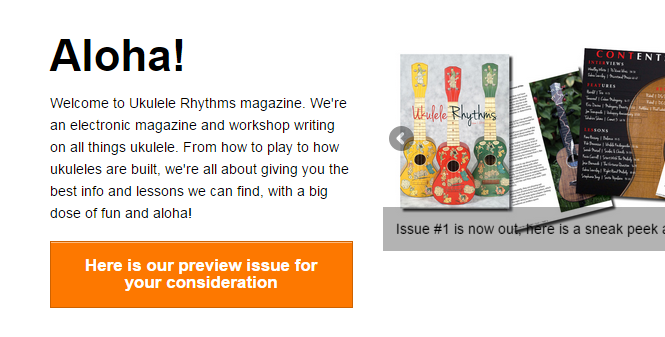 Ukulele Rhythms“Ukulele Rhythms” is completely digital, or online only . You can enter your email to sign up to receive a free preview download of one of their issues. Their contributing writers are Sarah Maisel, Kimo Hussey, Craig Chee, Phil Doleman and so many others, Terrance Tan is the Editor. I basically paid for the subscription because of Sarah Maisel and Craig Chee’s involvement because I had just seen them perform at the MUD Festival in Lansing, Michigan, and also I was attracted to the cover art. Their articles and photography are cutting edge and their articles read like you are taking part in a workshop. They also run contests and inform you of giveaways. You can check it out here: Ukulele Rhythms.